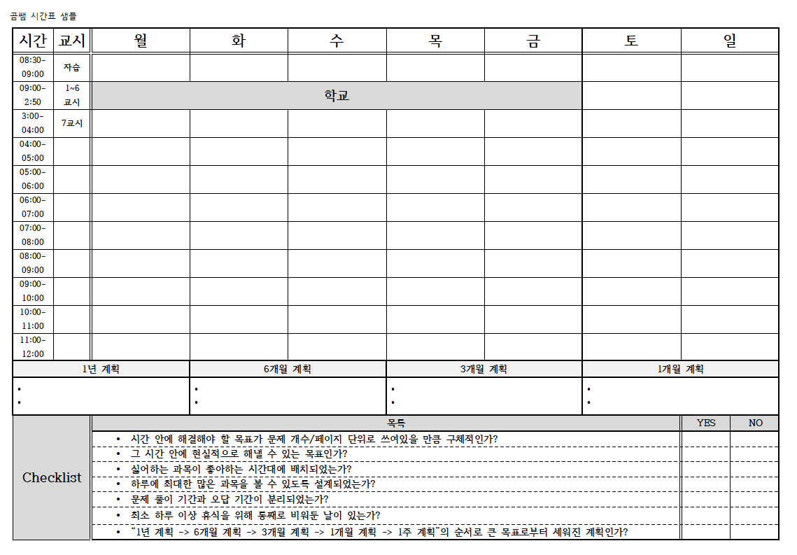 곰쌤 시험 공부 스케줄표, 1주일 단위 시간표 샘플